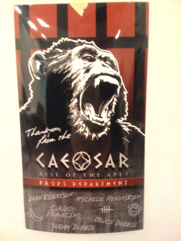 AICN got a hold of a "Thank You" card done up by the art department from Caesar: Rise of the Apes. It also gives us an idea of how the title character responsible for the monkeyocalypse (played by Andy Serkis via motion-capture) will look.
