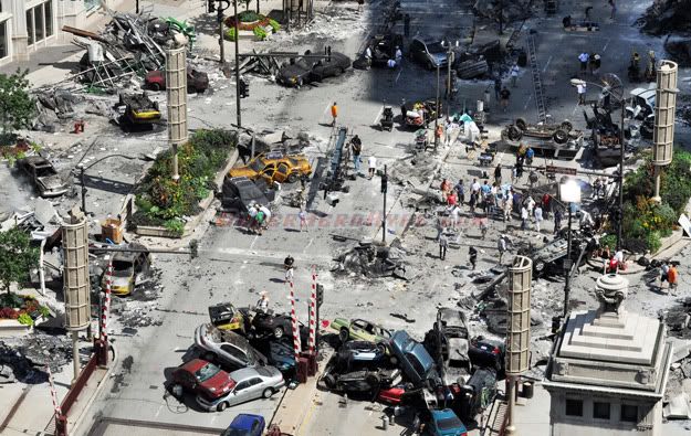Sat, July 17, 2010 Superherhype has gotten hold of a couple of new images from the Chicago set of the Michael Bay megabuster in the making. They feature the Transformers staples of mass destruction and Shia running from danger with a hot girl in tow.