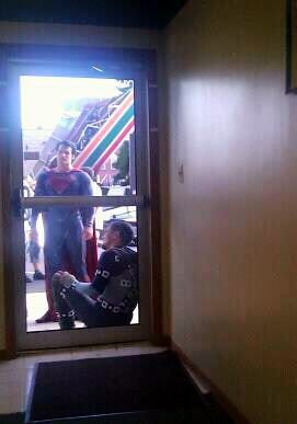 Another shot has just surfaced online within the depths of the SuperHeroHype Forums, courtesy of poster EtherMagic. The photo of Henry Cavill and Michael Shannon enjoying a respite from filming is one of the best on set shots I've seen. Looks they aren't going to be buying refreshments at the 7/11 though.