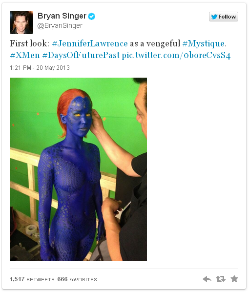 Bryan Singer, ever teasing the army of fanboys and fangirls that follow him eager for new X-Men: Days of Future Past, has tweeted the first look at Hunger Games and Silver Lining's Playbook star Jennifer Lawrence as the tormented Raven Darkholme, aka, Mystique.